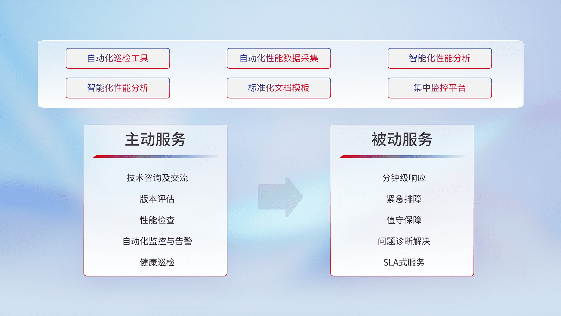 智能化工具和标准化文档,,,保障服务质量,,,提供主动服务(包含技术咨询、、版本评估、、、、性能检查、、、、自动化监控与告警、、健康巡检)和被动服务包含(分钟级响应、、、紧急排障、、、、值守保障、、问题诊断解决、、SLA服务)。。。